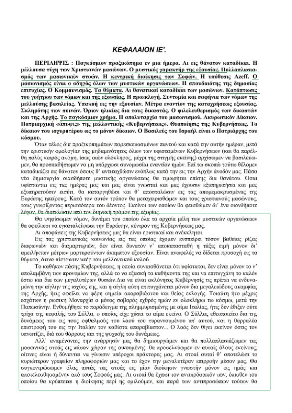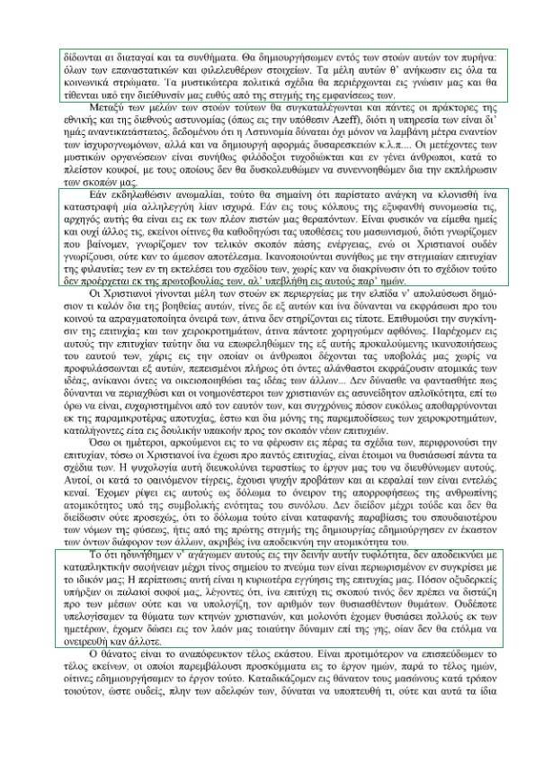 «Τώρα ποὺ μίλησες γιὰ Κανόνες τῆς Ἐκκλησίας, θυμήθηκα τὴν ἀπορία τῆς γιαγιᾶς· ῥώτησε τὴν θεία ἄν ἀλήθευε, ὅτι ὁ “τιμώμενος” ῥυπαρολόγος καθηγητής, Χρυσόστομος Σταμούλης, εἶχε ὄντως κάποιο ὀφφίκιο, καὶ ἡ θεία τῆς ἀπάντησε μὲσα ἀπὸ τὰ λόγια τοῦ Πατριάρχη: ἐπειδὴ ὁ καθηγητὴς “εἶχε προσφέρει πολλὰ(!)” στὴν θεολογία καὶ τὸν πολιτισμό, ἄρθρωνε “μεστὸ θεολογικὸ λόγο” ποὺ “ἄγγιζε τὶς ψυχὲς καὶ τὶς ἀναζωογονοῦσε(!)”, παρουσίᾳ τοῦ Ἀρχιεπισκόπου, ὁ Πατριάρχης τοῦ ἀπένειμε τὸ… ὀφφίκιο τοῦ Ἄρχοντα Διδασκάλου τῆς Ἐκκλησίας! Σὰν νὰ λέμε δηλαδή, Ξενία, πὼς ὁ Πατριάρχης… “ἀναζωογονήθηκε” μὲ τὴν προσβολὴ τῆς Θεοτόκου ἀπὸ τὸν μασο-ἀναθρεμμένο καθηγητή, καὶ τὸν ἔκρινε ἄξιο τῆς ἐμπιστοσύνης του, γιὰ νὰ ἐργαστοῦν ἀπὸ κοινοῦ στὶς μιαρὲς μασονικὲς ἀποστολές! Ἔχοντας φυσικὰ πάντα δίπλα καὶ τὸν παπο-ἀναθρεμμένο Ἀρχιεπίσκοπο… Θέλεις νὰ σοῦ μιλήσω λίγο γιὰ μασονικὲς ἀποστολές; Κάτσε νὰ βρῶ τὴν μία ἀπὸ τὶς δύο φωτογραφίες, στὸ κινητό, μὲ τὰ “Πρωτόκολλα τῆς Σιῶν”. Εἶναι τὰ ἑβραϊκὰ σχέδια γιὰ τὴν ὑποτιθέμενη ὑποταγὴ ὅλων τῶν λαῶν, στὸν ἀντίχριστο: “ΠΟΛΛΑΠΛΑΣΙΑΣΜΟΣ ΤΩΝ ΜΑΣΟΝΙΚΩΝ ΣΤΟΩΝ. Περιμένοντας τὴν ἐνθρόνισή μας, θὰ δημιουργοῦμε καὶ θὰ πολλαπλασιάζουμε τὶς μασονικὲς στοὲς σὲ κάθε χώρα τῆς οἰκουμένης· θὰ προσελκύουμε σὲ αὐτὲς ὅλους ἐκείνους, ποὺ εἶναι ἤ μποροῦν γίνουν ὑπέροχοι πράκτορές μας. Οἱ στοὲς αὐτὲς θὰ ἀποτελοῦν τὸ κυριότερο γραφεῖο πληροφοριῶν μας, καὶ τὸ μέσον ποὺ θὰ ἔχει τὴν μεγαλύτερη ἐπιρροή. Θὰ συγκεντρώσουμε ὅλες αὐτὲς τὶς στοὲς σὲ μία διοίκηση, γνωστὴ μόνο σὲ ἐμᾶς, ποὺ θὰ ἀποτελεῖται ἀπὸ τοὺς σοφούς μας. Η ΚΕΝΤΡΙΚΗ ΔΙΟΙΚΗΣΗ ΤΩΝ ΣΟΦΩΝ. Οἱ στοὲς θὰ ἔχουν τὸν ἀντιπρόσωπό τους, πίσω ἀπὸ τὸν ὁποῖο θὰ κρύβεται ἡ διοίκηση ποὺ εἴπαμε, καὶ ἀπὸ αὐτοὺς τοὺς ἀντιπροσώπους θὰ δίνονται οἱ διαταγὲς καὶ τὰ συνθήματα. Μέσα στὶς στοὲς θὰ δημιουργοῦμε τὸν πυρῆνα ὅλων τῶν ἐπαναστατικῶν καὶ φιλελεύθερων στοιχείων. Τὰ μέλη τους θὰ ἀνήκουν σὲ ὅλα τὰ κοινωνικὰ στρώματα. Τὰ μυστικότερα πολιτικὰ σχέδια θὰ μᾶς γίνονται γνωστά, καὶ θὰ ἀναλαμβάνονται ἀπὸ τὴν διεύθυνσή μας, ἀμέσως ἀπὸ τὴν στιγμὴ τῆς ἐμφάνισής τους. Ο ΜΑΣΟΝΙΣΜΟΣ ΕΙΝΑΙ Ο ΟΔΗΓΟΣ ΟΛΩΝ ΤΩΝ ΜΥΣΤΙΚΩΝ ΟΡΓΑΝΩΣΕΩΝ. Ἐὰν ἐκδηλωθοῦν ἀνωμαλίες, αὐτὸ θὰ σημαίνει ὅτι παρουσιάζεται ἀνάγκη νὰ κλονιστεῖ ἤ νὰ καταστραφεῖ μία ἰσχυρὴ ἀλληλεγγύη. Ἄν στοὺς κόλπους της ἐξυφανθεῖ κάποια συνωμοσία, ἀρχηγὸς της θὰ εἶναι ἕνας ἀπὸ τοὺς πλέον πιστοὺς ὑπηρέτες μας. Εἶναι φυσικὸ νὰ εἴμαστε ἐμεῖς καὶ ὄχι κάποιος ἄλλος, ἐκεῖνοι ποὺ καθοδηγοῦν τὶς ὑποθέσεις τοῦ μασονισμοῦ, διότι γνωρίζουμε ποῦ πηγαίνουμε, γνωρίζουμε τὸν τελικὸ σκοπὸ κάθε ἐνέργειας, ἐνῶ οἱ Χριστιανοὶ δὲν γνωρίζουν τίποτα, οὔτε κὰν τὸ ἄμεσο ἀποτέλεσμα. Ἱκανοποιοῦνται συνήθως μὲ τὴν στιγμιαία ἐπιτυχία τῆς φιλαυτίας τους, στὴν ἐκτέλεση τοῦ σχεδίου τους, χωρὶς κὰν νὰ διακρίνουν ὅτι τὸ σχέδιο αὐτὸ δὲν προέρχεται ἀπὸ τὴν πρωτοβουλία τους, ἀλλὰ τοὺς ὑποβλήθηκε ἀπὸ ἐμᾶς. ΚΑΤΑΠΤΩΣΗ ΤΟΥ ΓΟΗΤΡΟΥ ΤΩΝ ΝΟΜΩΝ ΚΑΙ ΤΗΣ ΕΞΟΥΣΙΑΣ. Διὰ τῆς ἐπιρροῆς μας, ἡ ἐκτέλεση τῶν νόμων τῶν Χριστιανῶν ἔχει περιοριστεῖ στὸ ἐλάχιστο. Τὸ γόητρο τῶν νόμων ὑποσκάπτεται μὲ τὶς φιλελεύθερες ἑρμηνείες, ποὺ τοὺς ἔχουμε εἰσαγάγει. Στὶς ἐξουσίες καὶ τὰ ζητήματα πολιτικῆς καὶ ἀρχῶν, τὰ δικαστήρια ἀποφασίζουν 