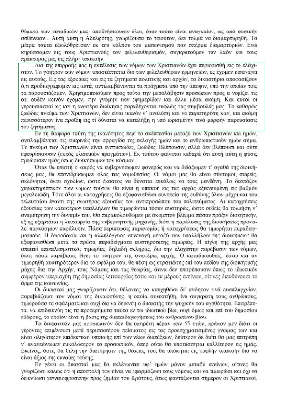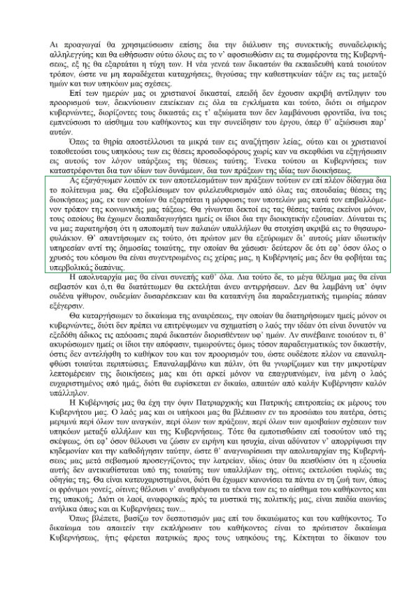 «Ἐννοεῖται! Ὁ πνευματικὸς ἀγῶνας κατὰ τῶν παθῶν μας, προϋποθέτει μεγάλη θέληση καὶ πραγματικὴ βία κατὰ τοῦ διεφθαρμένου ἑαυτοῦ μας! Ὁ ὁποῖος οὔτε στὴν νηστεία ὑποτάσσεται εὔκολα, οὔτε στὴν προσευχή, οὔτε παρακολούθηση τῶν λογισμῶν καὶ τῆς γλώσσας θέλει, ὅμως δὲν γίνεται ἀλλιῶς! Ἄν συνδυάσουμε, Ξενία, τὴν νοθεία τῆς Ὀρθοδοξίας καὶ τὴν Παναίρεση ποὺ θέλουν οἱ διεφθαρμένοι Μητροπολίτες, μὲ τὴν Πανθρησκεία ποὺ θέλουν οἱ ἄθλιοι Ἑβραῖοι, καὶ τὶς φιλελεύθερες ἑρμηνείες τῶν νόμων, μὲ τὶς πολιτικὲς ἐξουσίες καὶ τὰ δικαστήρια ποὺ ἀποφασίζουν ὅ,τι τοὺς προδιαγράφουν οἱ Ἑβραῖοι, καταλήγουμε στὰ ἀμείλικτα μέτρα καὶ τὴν ἄκαμπτη ἔξουσία τῶν Μασόνων, λόγῳ τῆς οἰκονομικῆς κρίσης ποὺ ἔχουν προγραμματίσει! Κάτσε νὰ σοῦ τὸ διαβάσω ἀπὸ μέσα: “Ο ΜΥΣΤΙΚΟΣ ΧΑΡΑΚΤΗΡΑΣ ΤΗΣ ΕΞΟΥΣΙΑΣ. Θὰ ψηφίσουμε νόμο, μὲ τὴν δύναμη τοῦ ὁποίου ὅλα τὰ ἀρχαῖα μέλη τῶν μυστικῶν ὀργανώσεων, θὰ ὀφείλουν νὰ έγκαταλείψουν τὸ κέντρο τῆς κυβέρνησής μας, τὴν Εὐρώπη. Οἱ ἀποφάσεις τῆς κυβέρνησής μας θὰ εἶναι ὁριστικὲς καὶ ἀμετάκλητες. Στὶς χριστιανικὲς κοινωνίες στὶς ὁποῖες ἔχουμε ἐνσπείρει τόσο βαθειὲς ῥίζες διαφωνιῶν καὶ διαμαρτυριῶν, δὲν εἶναι δυνατὸν νὰ ἀποκατασταθεῖ ἡ τάξη, παρὰ μόνο μὲ ἀμείλικτα μέτρα, ποὺ θὰ μαρτυροῦν ἔξουσία ἄκαμπτη. Εἶναι ἀνώφελο νὰ δίνεται προσοχὴ στὰ θύματα, τὰ ὁποῖα πέφτουν ὑπὲρ τοῦ μελλοντικοῦ καλοῦ. Τὸ καθῆκον κάθε κυβέρνησης, ἡ ὁποία συναισθάνεται τὴν ὕπαρξή της, δὲν εἶναι μόνο νὰ ἀπολαμβάνει τὰ προνόμιά της, ἀλλὰ τὸ νὰ ἐξασκεῖ τὰ καθήκοντά της, καὶ νὰ ἐπιτυγχάνει τὸ καλό, ἔστω καὶ μέσα ἀπὸ μεγαλύτερες θυσίες. Γιὰ νὰ εἶναι κάποια κυβέρνηση, ἀκλόνητη, πρέπει νὰ ἐνδυναμώσει τὴν αἴγλη τῆς ἰσχύος της, ἡ ὁποία ὀφείλει νὰ φέρει σημεῖα ἀπαραβίαστου καὶ θείας ἐκλογῆς [προκειμένου γιὰ τοὺς Ἑβραίους, ἐννοεῖ τὴν διαβολικὴς ἐκλογή]. Τέτοια ἦταν ὥς τώρα ἡ ῥωσικὴ Μοναρχία, ὁ μόνος σοβαρὸς ἐχθρός μας σὲ ὁλόκληρο τὸν κόσμο, μετὰ ἀπὸ τὴν παποσύνη [τότε ποὺ τὸ ἔγραφαν αὐτὸ οἱ Ἑβραῖοι, δὲν εἶχαν ὑποδουλώσει ἀκόμα οἰκονομικὰ τὸ Βατικανό]. Θυμηθεῖτε τὸ παράδειγμα τῆς πλημμυρισμένης μὲ αἷμα Ἰταλίας, ἡ ὁποία δὲν πείραξε οὔτε τρίχα ἀπὸ τὸ κεφάλι τοῦ Σύλλα, ὁ ὁποῖος εἶχε χύσει τὸ αἷμα ἐκεῖνο. Μὲ τὴν δύναμή του ὁ Σύλλας, θεοποιήθηκε στὰ μάτια τοῦ λαοῦ ποὺ ἦταν τυραννισμένος ἀπὸ αὐτόν, καὶ ἡ θαρραλέα ἐπιστροφή του στὴν Ἰταλία, τὸν κατέστησε ἀπαραβίαστη κυβέρνηση. Ὁ λαὸς δὲν πειράζει ἐκεῖνον ποὺ τὸν ὑπνωτίζει, μὲ τὸ θάρρος καὶ τὴν ψυχικὴ δύναμή του. ΤΟ ΠΑΓΚΟΣΜΙΟ ΧΡΗΜΑ. Ἄς ἐξετάσουμε λοιπὸν ἀπὸ τὰ ἀποτελέσματα τῶν πράξεων αὐτῶν, ἕνα ἐπιπλέον δίδαγμα γιὰ τὸ πολίτευμα μας. Θὰ ἐξοβελίσουμε τὸν φιλελευθερισμὸ ἀπὸ ὅλες τὶς σπουδαῖες θέσεις τῆς διοικήσεώς μας, ἀπὸ τὶς ὀποῖες θὰ ἐξαρτᾶται ἡ μόρφωση τῶν ὑποτελῶν μας, κατὰ τὸν ἐπιβαλλόμενο τρόπο τῆς κοινωνικῆς τάξης μας. Σὲ αὐτὲς τὶς θέσεις θὰ γίνονται δεκτοὶ μόνο ἐκεῖνοι, τοὺς ὁποίους θὰ ἔχουμε διαπαιδαγωγήσει ἐμεῖς οἱ ἴδιοι, γιὰ τὴν διοικητικὴ ἐξουσία. Μπορεῖ νὰ μᾶς πεῖ κάποιος ὅτι ἡ ἀποπομπὴ τῶν παλαιῶν ὑπαλλήλων θὰ στοιχίσει ἀκριβὰ στὸ θησαυροφυλάκιο. Ἀλλὰ πρῶτον θὰ τοὺς βροῦμε μία ἰδιωτικὴ ὑπηρεσία ἀντὶ αὐτῆς τῆς δημόσιας· δεύτερον, ἐφ’ ὅσον ὅλος ὁ χρυσὸς τοῦ κόσμου θὰ εἶναι συγκεντρωμένος στὰ χέρια μας, ἡ κυβέρνησή μας δὲν θὰ φο