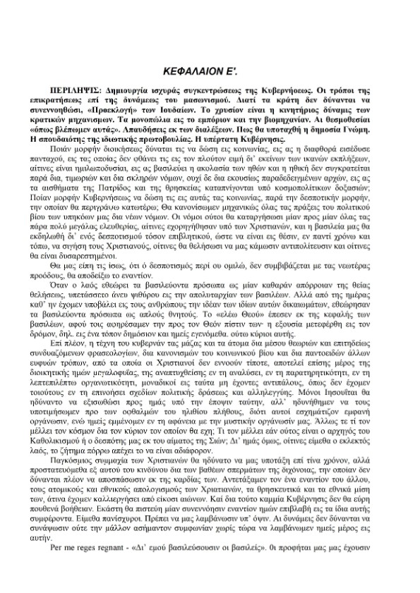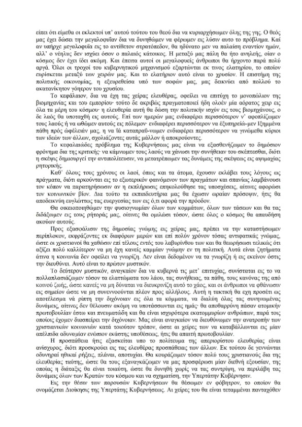 «Γιὰ ἀρχὴ θὰ σοῦ πῶ ὅτι αὐτὲς οἱ σελίδες προέρχονται ἀπὸ βιβλίο ποὺ γράφτηκε πρὶν ἀπὸ πάρα πολλὰ χρόνια, ἀπὸ Ἑβραίους ποὺ μισοῦν θανάσιμα τοὺς Χριστιανούς! Ὁ τίτλος του εἶναι, “ΤΑ ΠΡΩΤΟΚΟΛΛΑ ΤΗΣ ΣΙΩΝ”, καὶ περιέχει τὰ σατανικὰ σχέδιά τους γιὰ τὴν ὁλοσχερῆ καὶ ἀτιμωτικὴ ὑποταγή μας στοὺς Ἑβραίους! Γιὰ νὰ καταλάβεις, Παρασκευή, οἱ Ἕλληνες πολιτικοὶ εἶναι τὰ δουλικὰ τῶν Ἑβραίων, οἱ ὁποῖοι πληρώνουν τοὺς πολιτικοὺς γιὰ νὰ μᾶς ὑποτάξουν τοὺς Ἕλληνες, στὸ ὑπερκράτος ποὺ ἑτοιμάζουν ὅλοι μαζὶ γιὰ τὸν ἀντίχριστο! Περίμενε, νὰ τὸ βρῶ στὸ τηλέφωνό μου: “Ποιός μπορεῖ νὰ ἀνατρέψει μία ἀόρατη ἰσχύ; Διότι τέτοια εἶναι ἡ δική μας, ποὺ καλύπτεται ἀπὸ τὴν ἐξωτερικὴ ἐπιφάνεια τοῦ μασονισμοῦ. Αὐτὴ ἡ ἀόρατη ἰσχύς μας θὰ μποροῦσε νὰ ἦταν ἀβλαβής, καὶ νὰ ὑφίσταται στὸ κράτος χωρὶς νὰ παραβλάπτει τὴν εὐημερία τῶν λαῶν, ἔαν ἡ ἐλευθερία τους βασιζόταν στὶς ἀρχὲς τῆς Πίστεως στὸν Θεό, καὶ τῆς ἀνθρώπινης συναδέλφωσης —δηλαδὴ μακριὰ ἀπὸ τὴν ἰδέα τῆς ἰσότητας ποὺ τοὺς διδάξαμε ἐμεῖς, μὲ τὴν ὁποία ἐγκαθιδρύεται ἡ ὑποταγή τους σὲ ἐμᾶς. Μὲ τὴν Χριστιανικὴ Πίστη ὁ λαὸς θὰ βάδιζε ταπεινὸς καὶ ἥσυχος, καθοδηγούμενος ἀπὸ τὸν πνευματικὸ ποιμένα του, ἀποδεχόμενος τὴν κατὰ Θεὸν διανομὴ τῶν ἀγαθῶν τοῦ κόσμου αὐτοῦ. Νὰ γιατὶ εἶναι ἀναγκαῖο νὰ καταστρέψουμε τὴν Πίστη, νὰ ἀποσπάσουμε ἀπὸ τὸν νοῦ τῶν Χριστιανῶν αὐτὴν τὴν ἀρχὴ τῆς Θεότητος καὶ τοῦ Ἁγίου Πνεύματος, γιὰ νὰ ὑποκαταστήσουμε σὲ Αὐτά, τοὺς ὑλικοὺς ὑπολογισμοὺς καὶ τὶς ὑλικὲς ἀνάγκες. Γιὰ νὰ μὴν ἔχουν οἱ Χριστιανοὶ τὸν χρόνο νὰ σκέπτονται, καὶ νὰ ἐξετάζουν ὅσα χρειάζεται γύρω ἀπὸ τὸν ἑαυτό τους, πρέπει νὰ τοὺς περισπᾶμε τὴν προσοχή τους μέσῳ τῶν βιομηχανιῶν καὶ τοῦ ἐμπορίου. Μὲ αὐτὸν τὸν τρόπο τὰ Ἔθνη θὰ παλεύουν μεταξύ τους τὸ καθένα γιὰ τὰ ὀφέλη του, καὶ δὲν θὰ ἀντιλαμβάνονται τὸν κοινὸ ἐχθρό τους. Γιὰ νὰ μπορέσουμε νὰ διαλύσουμε καὶ νὰ καταστρέψουμε ἐντελῶς τὴν κοινωνία τῶν Χριστιανῶν, εἶναι ἀνάγκη νὰ καταστήσουμε τὴν κερδοσκοπία, ὡς τὴν βάση τῆς βιομηχανίας, μὲ τρόπο ποὺ ὅ,τι προσφέρει ἡ γῆ τῶν δικῶν τους βιομηχανιῶν, νὰ πέφτει στὰ ταμεῖα μας. Ἡ ζωηρὴ πάλη γιὰ τὴν οἰκονομικὴ ὑπεροχή, καὶ οἱ συγκρούσεις μέσα στὸν οἰκονομικὸ βίο, θὰ δημιουργοῦν κοινωνίες ἀπογοητευμένες, ψυχρές καὶ χωρὶς καρδιά, οἱ ὁποῖες θὰ ἔχουν μία ἀπόλυτη ἀπέχθεια πρὸς τὴν πολιτικὴ καὶ τὴν θρησκεία. Ὁ μόνος ὁδηγός τους θὰ εἶναι ὁ ὑπολογισμός, δηλαδὴ ὁ χρυσός, πρὸς τὸν ὁποῖο θὰ ἔχουν ἀληθινὴ λατρεία, ἐξ αἰτίας τῶν ὑλικῶν ἀπολαύσεων ποὺ μπορεῖ νὰ τοὺς χορηγεῖ. Γιὰ νὰ ἔχει τὰ χέρια του ἐλεύθερα τὸ κεφάλαιο, ὀφείλει νὰ ἐπιτύχει τὸ μονοπώλιο τῆς βιομηχανίας καὶ τοῦ ἐμπορίου, κάτι ποὺ πραγματοποιεῖ διαρκῶς ἕνα ἀόρατο χέρι σὲ ὅλα τὰ μέρη τοῦ κόσμου. Ἡ ἐλευθερία αὐτὴ ΘΑ ΔΩΣΕΙ ΤΗΝ ΠΟΛΙΤΙΚΗ ΙΣΧΥ ΣΤΟΥΣ ΒΙΟΜΗΧΑΝΟΥΣ καὶ ὁ λαὸς ΘΑ ΥΠΟΤΑΧΘΕΙ ΣΕ ΑΥΤΟΥΣ. Μᾶς ἐνδιαφέρει περισσότερο νὰ ἐκμεταλλευόμαστε τὰ αὐξημένα πάθη τοῦ λαοῦ πρὸς ὠφέλειά μας, καὶ νὰ γινόμαστε κυρίαρχοι τῶν ἰδεῶν τῶν ἄλλων, περισσότερο σχολιάζοντας τὶς ἰδέες τους ὅπως μᾶς συμφέρει, παρὰ ἀποκρούοντάς τες. Τὸ κεφαλαιῶδες πρόβλημα τῆς κυβέρνησής μας, εἶναι μέσα ἀπὸ τὴν κριτική, νὰ ἐξασθενίζουμε τὸ θάρρος τοῦ λαοῦ· νὰ τὸν κάνουμε νὰ χάνει τὴν συνήθεια νὰ σκέφτεται, διότη ἡ σκέψη δημιουργ