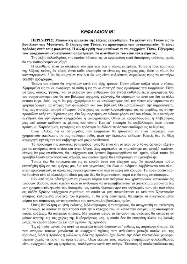 «Οἱ θεωρίες τῆς ἀποστασίας ἔθρεψαν τὸν ΜΗΔΕΝΙΣΜΟ ΤΗΣ ΚΑΤΑΣΤΡΟΦΗΣ, ποὺ λέει ὅτι δὲν ὑπάρχει θεσμὸς τῆς κοινωνίας μας, ποὺ δὲν πρέπει νὰ καταστραφεῖ. Ἡ… “δημιουργικὴ καταστροφή”, σκοπεύει νὰ συνθλίψει ὅλες τὶς παραδεδομένες ἀνθρώπινες ἀξίες! Γιὰ τὴν ἐλευθερία, οἱ μασόνοι ἔχουν τὴν δική τους ἑρμηνεία · ἄκου: “Τὴν λέξη “ἐλευθερία”, ποὺ μπορεῖ κάποιος νὰ τὴν ἑρμηνεύσει κατὰ διάφορους τρόπους, ἐμεῖς θὰ τὴν ὁρίσουμε ὡς ἑξῆς· ἡ ἐλευθερία εἶναι τὸ δικαίωμα τοῦ πράττειν, ὅ,τι ὁ νόμος ἐπιτρέπει. Θὰ κάνει λοιπὸν κάποιος, τέτοια ἑρμηνεία τῆς λέξης αὐτῆς, ὥστε κάθε ἐλευθερία νὰ βρίσκεται στὰ χέρια μας. Διότι οἱ νόμοι θὰ καταστρέφουν ἤ θὰ δημιουργοῦν ὁτιδήποτε θὰ μᾶς εἶναι εὐάρεστο, σύμφωνα πρὸς τὸ πρόγραμμά μας”».