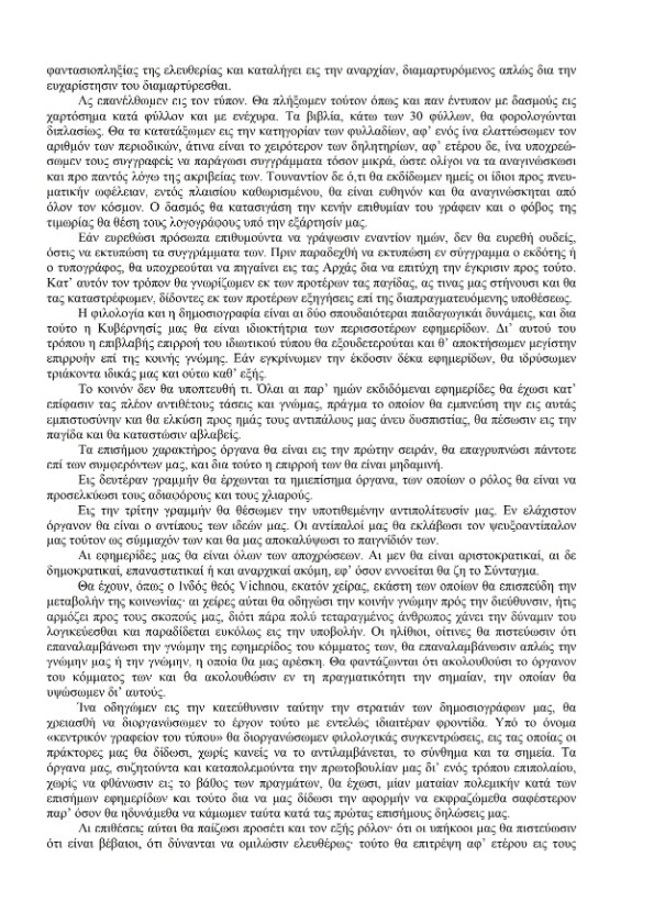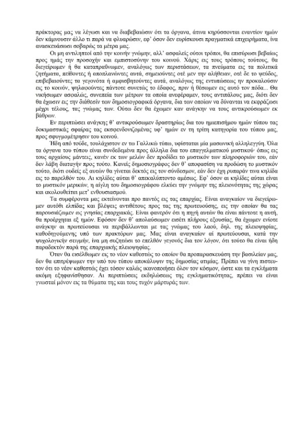 «Ποῦ νὰ τὸ χωρέσει τὸ μυαλό, ὅτι οἱ “ἀπόρρητες” πληροφορίες ποὺ θὰ “ἀποδεσμεύει” σταδιακὰ ἡ ἀμερικανικὴ κυβέρνηση, θὰ… “ἐκπαιδεύουν” γιὰ τὸν παγκόσμιο τρόμο, ποὺ θὰ προκαλέσουν οἱ σαλεμένοι ἡγέτες; Ἄκου Εὔβουλε, τί γράφουν οἱ Ἑβραῖοι στὰ “Πρωτόκολλά τους”, γιὰ τὸν τρόπο ποὺ θὰ χρησιμοποιήσουν τὸν τύπο καὶ σὲ αὐτὸ τὸ κεφάλαιο ποὺ ἄνοιξαν ἐπισήμως, μὲ τοὺς “ἐξωγήινους”: “Οἱ ἐφημερίδες μας θὰ εἶναι ὅλων τῶν ἀποχρώσεων. Θὰ ἔχουν ὅπως ὁ Ἰνδὸς θεὸς ἑκατὸ χέρια, καθένα ἀπὸ τὰ ὁποῖα θὰ ἐπισπεύδει τὴν μεταβολὴ τῆς κοινωνίας· τὰ χέρια αὐτὰ θὰ ὁδηγοῦν τὴν κοινὴ γνώμη πρὸς τὴν διεύθυνση ποὺ ἁρμόζει στοὺς σκοπούς μας, διότι ὁ πάρα πολὺ ταραγμένος ἄνθρωπος χάνει τὴν δύναμη στὸ νὰ λογικεύεται, καὶ παραδίνεται εὔκολα στὴν ὑποβολή. Οἱ ἠλίθιοι, οἱ ὁποῖοι θὰ πιστεύουν ὅτι ἐπαναλαμβάνουν τὴν γνώμη τῆς ἐφημερίδας τοῦ κόμματός τους, θὰ ἐπαναλαμβάνουν ἁπλῶς τὴν γνώμη μας, ἤ τὴν γνώμη ποὺ θὰ μᾶς ἀρέσει. Θὰ φαντάζονται ὅτι ἀκολουθοῦν τὸ ὄργανο τοῦ κόμματός τους, καὶ στὴν πραγματικότητα θὰ ἀκολουθοῦν τὴν σημαία ποὺ θὰ ὑψώσουμε ἐμεῖς γιὰ αὐτούς. / Οἱ μὴ ἀντιληπτοὶ ἀπὸ τὴν κοινὴ γνώμη, ἀλλὰ ἀσφαλεῖς τρόποι, θὰ ἐπισύρουν βεβαίως τὴν προσοχὴ καὶ τὴν ἐμπιστοσύνη τοῦ κοινοῦ, πρὸς ἐμᾶς. Χάρη στοὺς τρόπους αὐτούς, θὰ διεγείρουμε ἤ θὰ καταπραΰνουμε, ἀναλόγως τῶν περιστάσεων, τὰ πνεύματα στὰ πολιτικὰ ζητήματα, ἀφήνοντάς ὅπως εἶναι, ἤ παραποιῶντας τα· λέγοντας ἄλλοτε τὴν ἀλήθεια καὶ ἄλλοτε κάποιο ψεῦδος, ἐπιβεβαιώνοντας τὰ γεγονότα, ἤ διαψεύδοντάς τα, ἀνάλογα τὴν ἐντύπωση ποὺ προκαλοῦν στὸ κοινό. Θὰ νικήσουμε ἀσφαλῶς τοὺς ἀντιπάλους μας, ἐφαρμόζοντας τὰ μέτρα ποὺ ἀναφέραμε, διότι δὲν θὰ ἔχουν στὴν διάθεσή τους δημοσιογραφικὰ ὄργανα, μέσῳ τῶν ὁποίων νὰ μποροῦν νὰ ἐκφράζουν τὶς γνῶμες τους, μέχρι τέλους. Ἔτσι δὲν θὰ ἔχουμε κὰν ἀνάγκη, νὰ τοὺς ἀντικρούσουμε ἐκ βάθρων”. Θὰ σοῦ διαβάσω καὶ κάτι γιὰ τὸ… “ἀλάνθαστο” τοῦ “νέου πολιτεύματος”, ὅπως λένε οἱ αἰθεροβάμονες Ἑβραῖοι, τὴν… “αἰχμαλωσία” τῶν λαῶν. “Ὅταν θὰ εἰσέλθουμε στὸ νέο καθεστὼς ποὺ θὰ προετοιμάσει τὴν βασιλεία μας, δὲν θὰ ἐπιτρέψουμε τὴν ἀποκάλυψη τῆς ΔΗΜΟΣΙΑΣ ΑΤΙΜΙΑΣ ἀπὸ τὸν τύπο. Πρέπει νὰ γίνει πιστευτό, ὅτι τὸ νέο καθεστὼς ἔχει τόσο καλὰ ἱκανοποιήσει ὅλον τὸν κόσμο, ὥστε καὶ τὰ ἐγκλήματα ἀκόμα ἐξαφανίστηκαν. Οἱ περιπτώσεις ἐκδήλωσης τῆς ἐγκληματικότητας, πρέπει νὰ εἶναι γνωστὲς μόνο στὰ θύματά της, καὶ τοὺς τυχὸν μάρτυρές τους”… Εἴμαστε βέβαιοι πὼς ἐκεῖνο ποὺ πλάθουν τὰ νοσηρὰ ἑβραϊκὰ μυαλά, θὰ εἶναι μόνο μία ΔΗΜΟΣΙΑ ΑΤΙΜΙΑ· ἀλλὰ θὰ τὸ θυμόμαστε καὶ στὴν περίπτωση ποὺ ὁ ΔΙΚΤΑΤΟΡΑΣ “μαριονέτα”, τολμήσει νὰ μᾶς κάνει στοὺς Ἕλληνες νύξη γιὰ… “συμμετοχὴ” μας, στὸν ἀντίχριστο πόλεμο τῶν Ἑβραίων! Συγκεκριμένα ὁ πατέρας μου εἶπε, πὼς σὲ ἕναν τέτοιο ΑΜΥΑΛΟ ΥΠΑΙΝΙΓΜΟ, θὰ ἔχει μπλέξει ἄσχημα, μαζί μας!».
